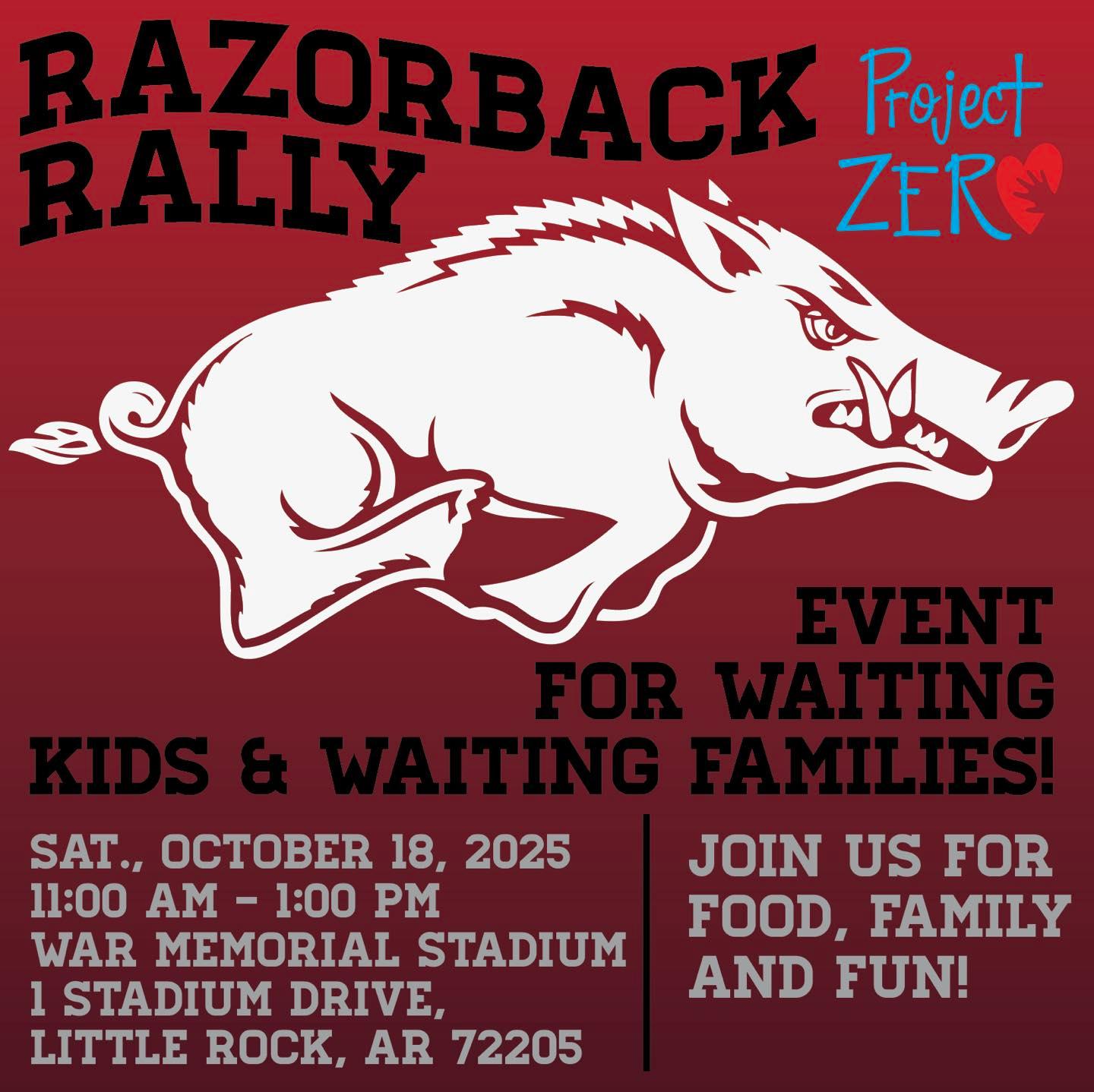 Project Zero: Razorback Rally Oct. 18, 2025 11 a.m. A fun day of football, games & fellowship at the big stadium in Little Rock. Open Arkansas adoptive families are encouraged to attend and connect with waiting kids of all ages and our state’s amazing DCFS adoption staff. Time: 11:00 AM - 1:00 PM Click Here for Project Zero's Event Page Click Here for Project Zero's Facebook Page